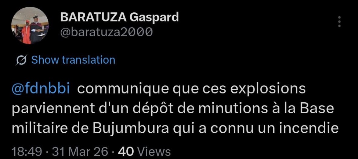 Dans un message publié sur la plateforme X (anciennement Twitter), le porte-parole de l’armée burundaise a confirmé que les détonations provenaient bien de ce dépôt de munitions situé au camp militaire de Bujumbura.